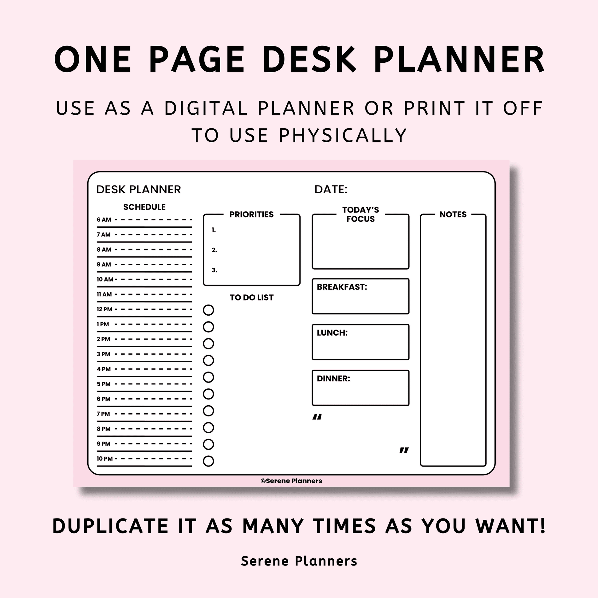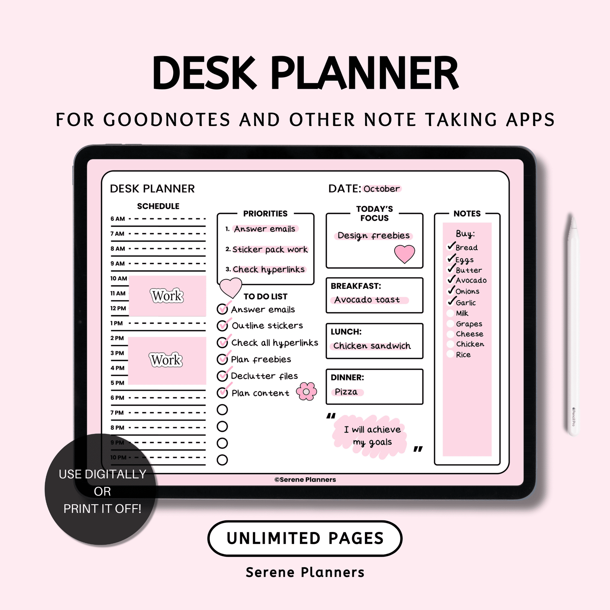 This Desk Planner template can be used on Goodnotes, Notability and other PDF readers. Or print it off and use it physically.