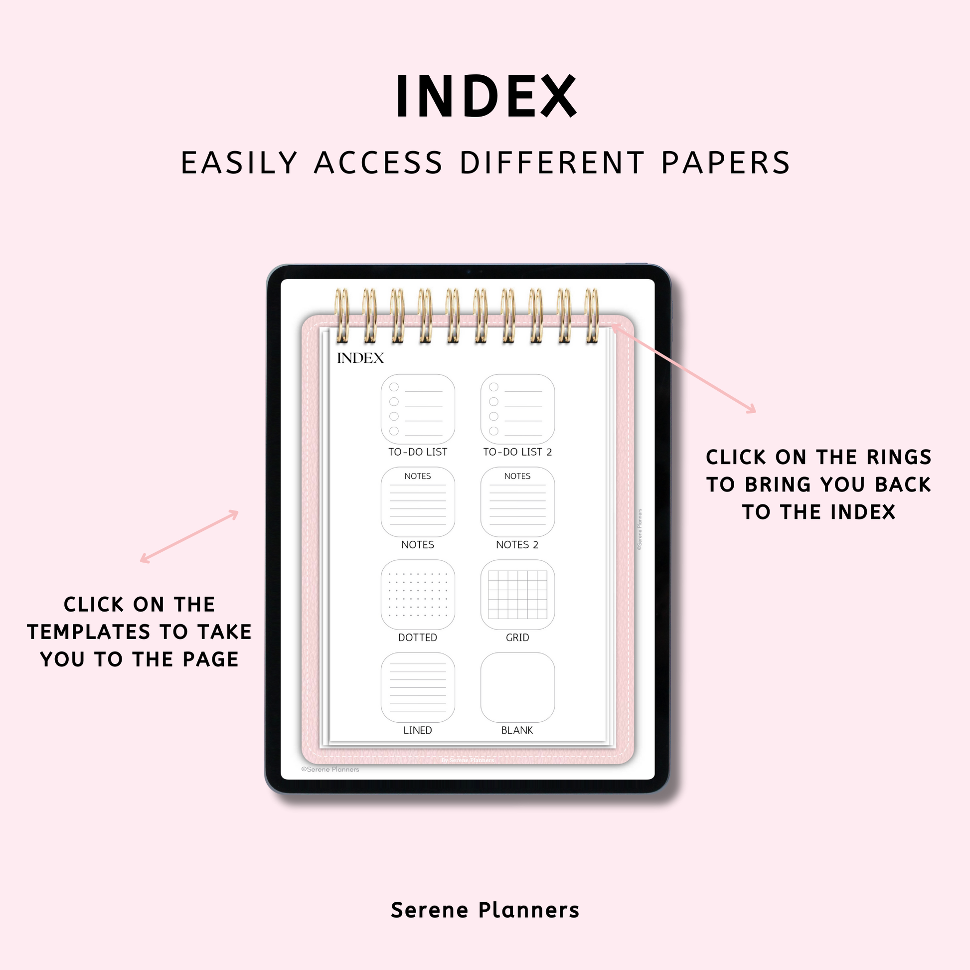 The index page is hyperlinked, allowing you to easily access the templates. Need to go back to the index? Just click on the rings to take you back. The digital notebook can be used on Goodnotes, Notability and other PDF readers.